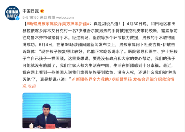 断臂男孩家属驳斥美方抹黑新疆:胡说八道!