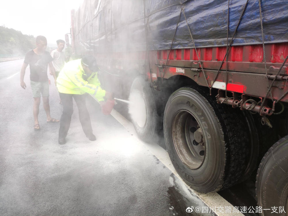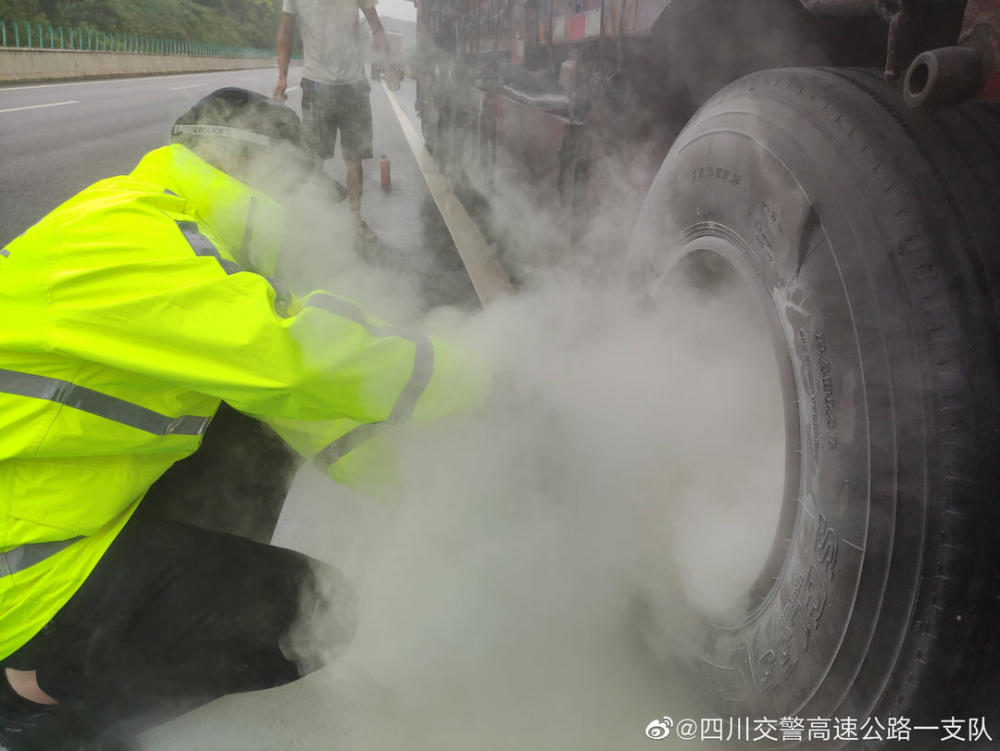 辅警梁恩超拿着灭火器冲到现场后,不顾危险快速处置正在燃烧的车胎,明火很快被扑灭,但轮轴中心处还在冒烟,有复燃的风险。民警立即让司机打开车载淋水,利用淋水对车轮、车轴、车架等降温,最终成功排除险情。
