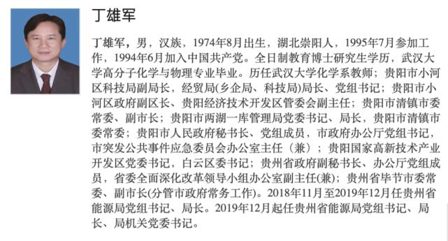 2016年11月,丁雄军成为毕节市委常委、副市长,2年后转任贵州省能源局党组书记、局长,至今未满3年。