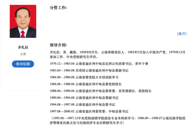齐扎拉则是云南人,长期在云南工作。2010年9月,时任云南省委常委、迪庆州委书记的齐扎拉跨省赴西藏,历任西藏自治区党委常委、统战部部长,西藏自治区党委常委、拉萨市委书记等,2017年1月晋升为自治区政府主席。