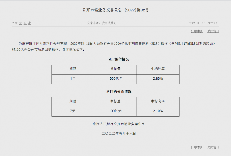 央行在公告中表示,为维护银行体系流动性合理充裕,2022年5月16日人民银行开展1000亿元中期借贷便利(MLF)操作(含对5月17日MLF到期的续做)和100亿元公开市场逆回购操作。