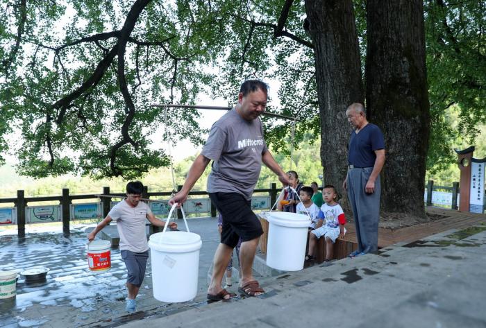 8月22日,四川省华蓥市红岩乡的党员干部为茶园村王家院子的群众挑送生活用水。