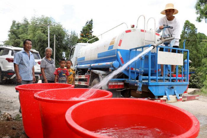 8月22日,在贵州省黔东南苗族侗族自治州岑巩县大有镇白岩山村,党员干部为当地村民送水。连日来,为降低旱情对农业生产和农村饮水带来的影响,出现旱情的地区多措并举,全力保障群众生产生活用水。