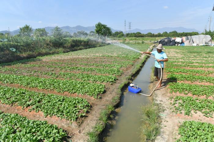 8月22日,在浙江省东阳市城东街道塘西村的农田里,蔬菜种植户利用抽水机给蔬菜浇水。