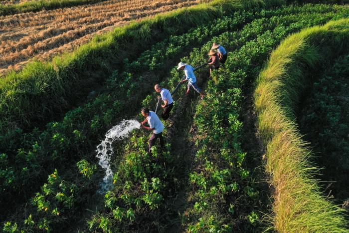8月22日,四川省广安市广安区恒升镇梓潼村党员干部和村民在大豆基地浇水抗旱。