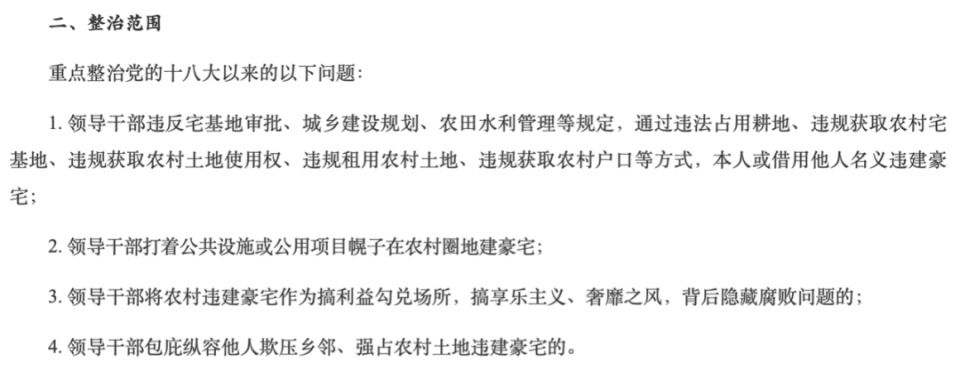 通知中提到,全面摸排梳理党的十八大以来副县处级以上领导干部在农村违规建豪宅问题线索,重点整治党的十八大以来的相关问题: