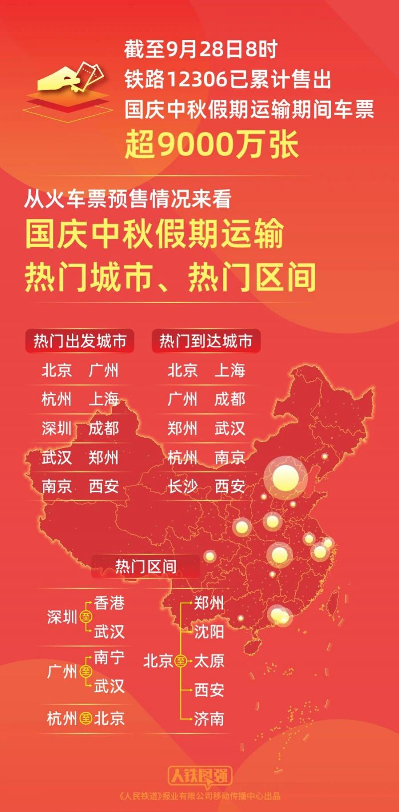 铁路国庆中秋假期运输9月29日启动,至10月10日结束,为期12天。国铁集团表示,截至9月28日8时,铁路12306已累计售出国庆中秋假期运输期间(9月29日至10月10日)车票超9000万张。