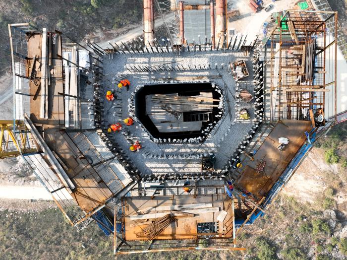 2023年2月1日拍摄的贵州花江峡谷大桥主塔施工现场(无人机照片)。新华社记者 欧东衢 摄