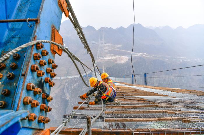 2024年3月27日,工人在贵州花江峡谷大桥的施工猫道上加固防护网(手机照片)。新华社记者 杨文斌 摄