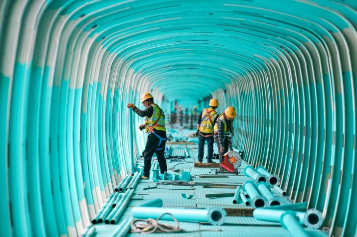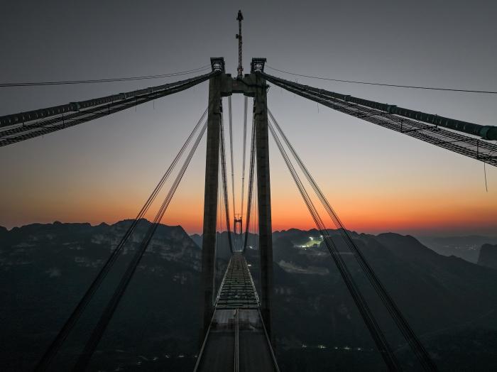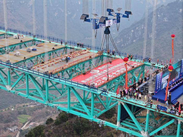 2025年1月14日,工人在为吊装贵州花江峡谷大桥最后一个节段钢桁梁做准备。新华社记者 杨文斌 摄