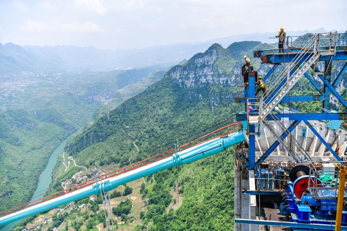 2025年6月6日,工人在贵州花江峡谷大桥桥塔顶上施工。新华社记者 杨文斌 摄