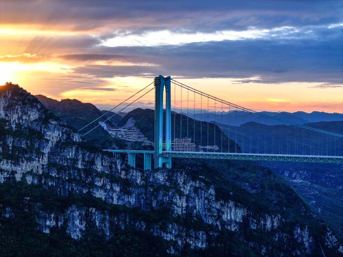 2025年9月27日拍摄的晚霞中的贵州花江峡谷大桥(无人机照片)。新华社记者 欧东衢 摄
