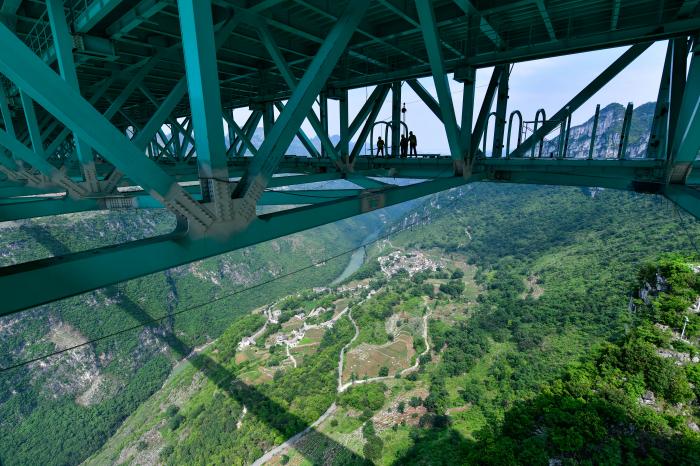 2025年6月11日,工人在贵州花江峡谷大桥上安装观景长廊。新华社记者 杨文斌 摄