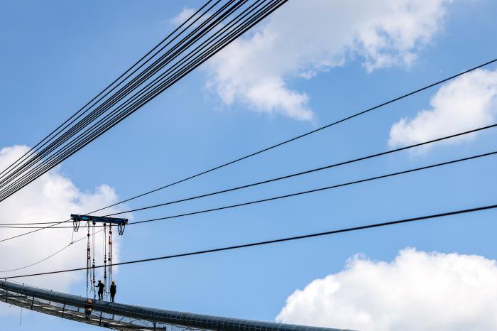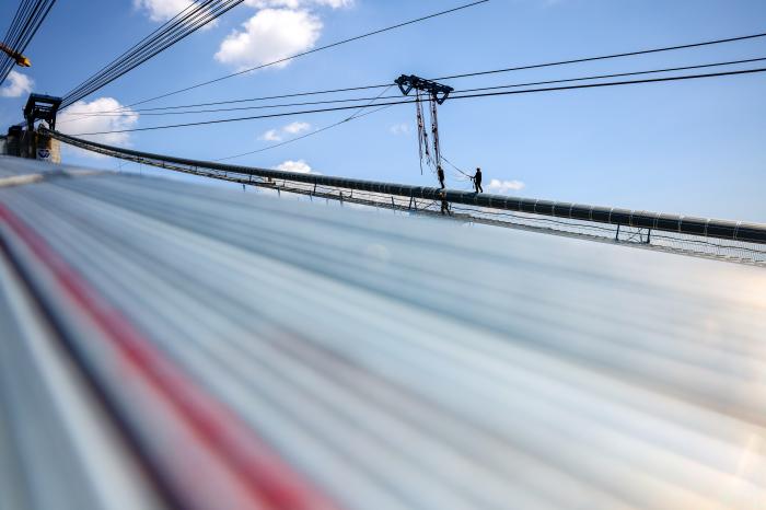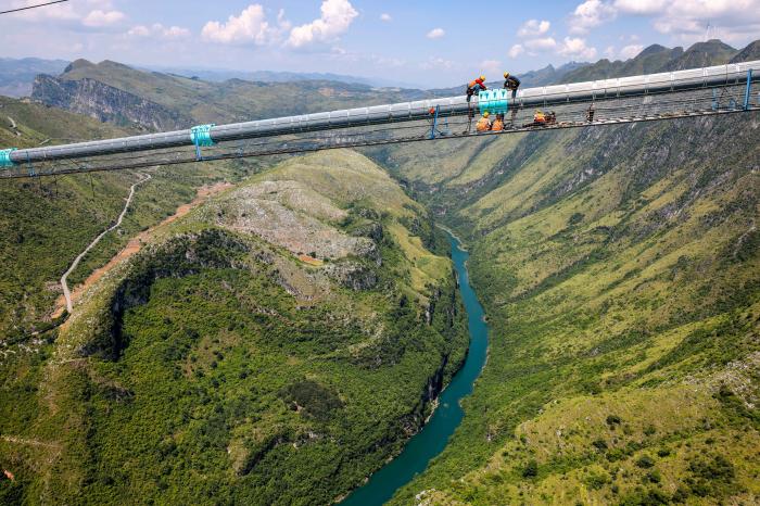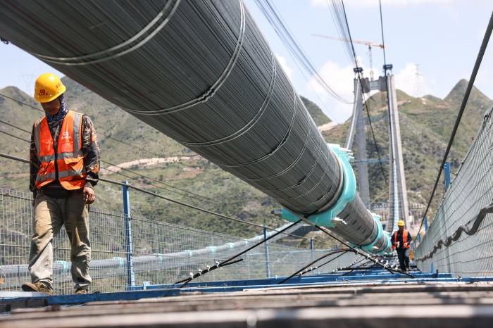 2024年9月4日,工人在贵州花江峡谷大桥的猫道上施工。新华社记者 欧东衢 摄
