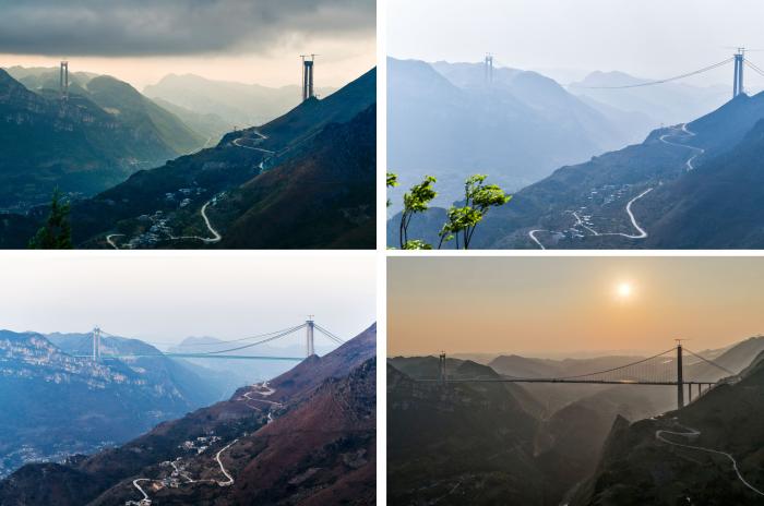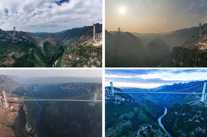拼版照片:左上图为桥塔建设中的贵州花江峡谷大桥(2023年11月8日摄),右上图为施工猫道搭建中的贵州花江峡谷大桥(2024年3月26日摄),左下图为合龙前的贵州花江峡谷大桥(2025年1月13日摄),右下图为通车前一天的贵州花江峡谷大桥(2025年9月27日摄)。新华社记者 杨文斌 摄