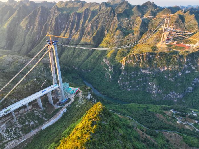 自2022年1月花江峡谷大桥正式开工建设以来,一组图片记录下了大桥从主塔浇筑、猫道搭建、钢桁梁吊装、合龙、荷载试验到通车的“成长”历程。2024年3月27日,工人在贵州花江峡谷大桥上加固施工猫道。新华社记者 杨文斌 摄