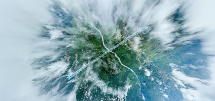 2025年9月26日拍摄的云雾缭绕中的贵州花江峡谷大桥(无人机照片)。新华社记者 欧东衢 摄