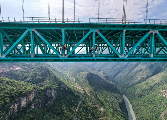 2025年6月11日,工人在贵州花江峡谷大桥上给桥体喷漆。新华社记者 杨文斌 摄