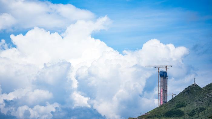 修建中的贵州花江峡谷大桥5号主塔(2023年8月3日摄)。新华社记者 陶亮 摄