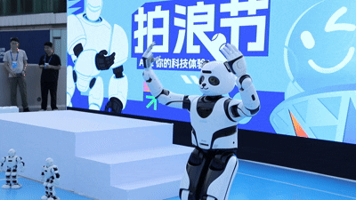 机器人巡游:熊猫机器人打太极比心,机器狗灵活矫健,机器人齐舞整齐划一。