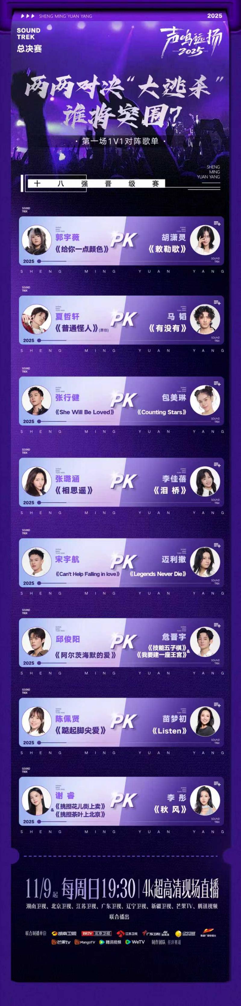 全国歌唱人才选拔节目《声鸣远扬2025》总决赛将于11月9日(今日)起每周日19:30,4K超高清现场直播,湖南卫视、北京卫视、江苏卫视、广东卫视、辽宁卫视、新疆卫视、芒果TV、腾讯视频八大平台联合播出。