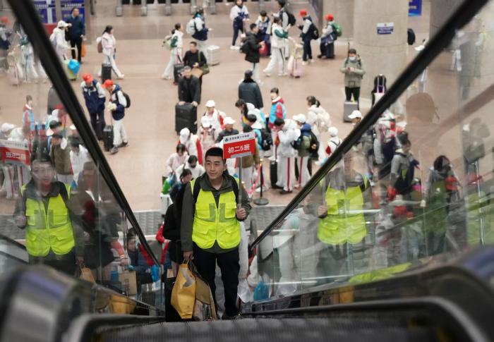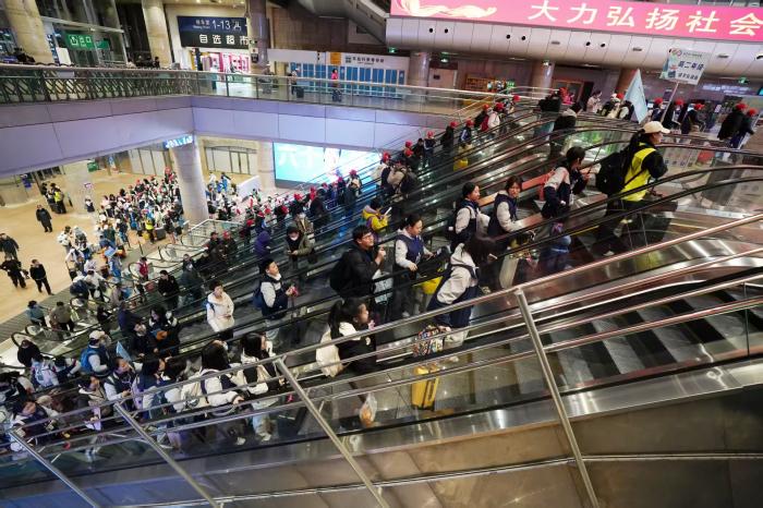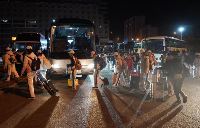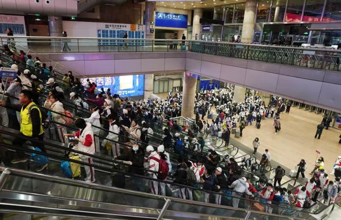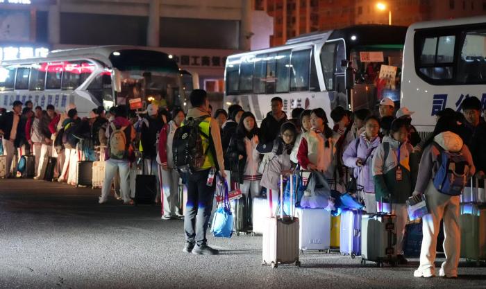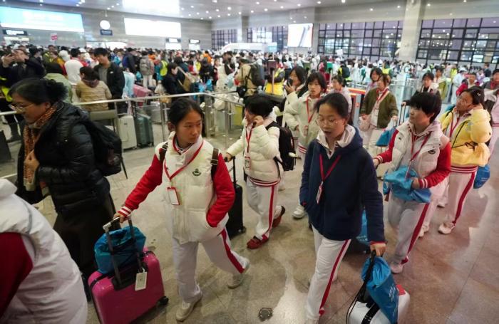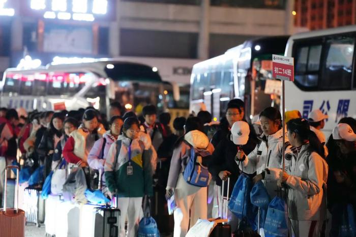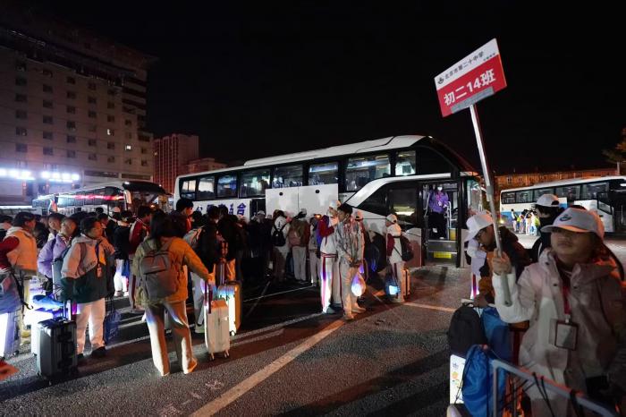 清晨5:30,学生们乘坐二十几辆大巴到达北京西站。