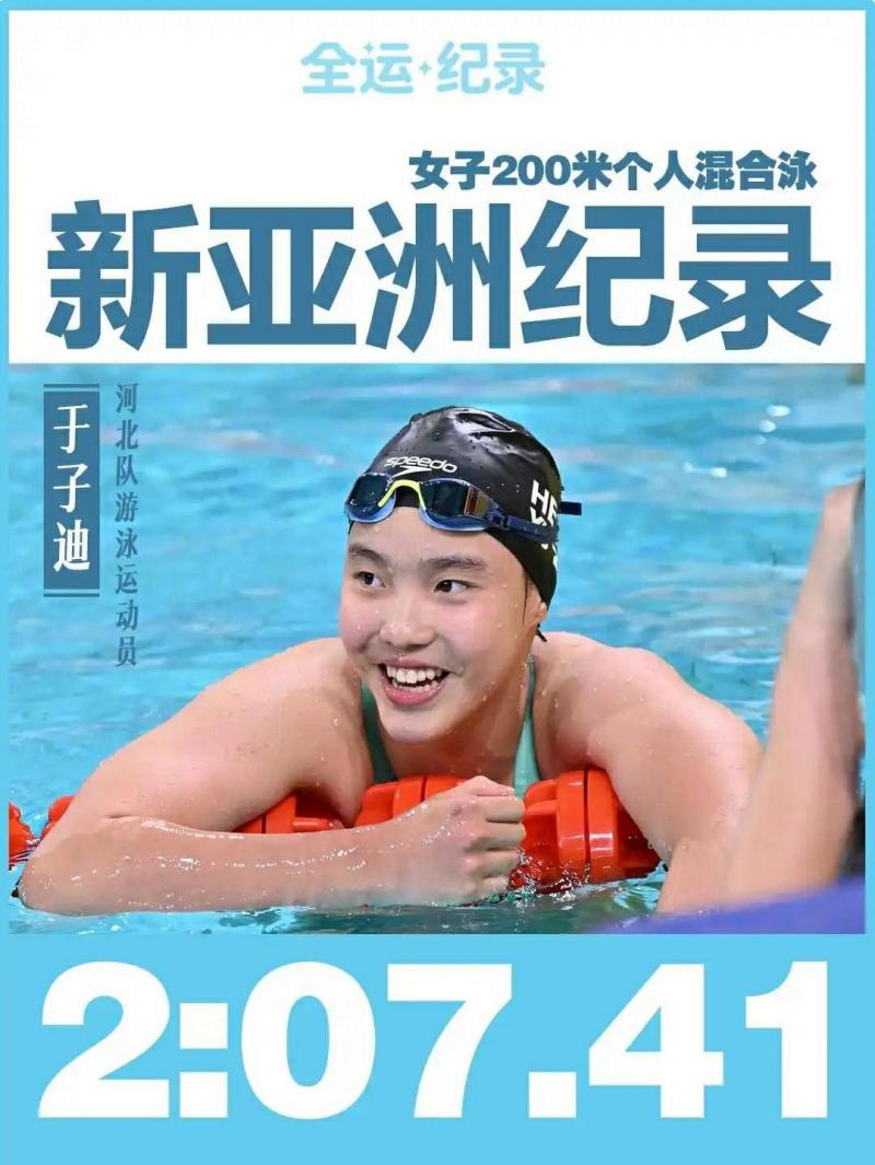 11月11日晚,在深圳进行的第15届全运会女子200米个人混合泳决赛中,来自河北保定的13岁小姑娘于子迪游出了2分07秒41的好成绩,打破了中国另一位游泳天才选手叶诗文在2012年伦敦奥运会上创造的该项目2分07秒57的亚洲纪录,并成为年龄最小的游泳亚洲纪录保持者。今夏新加坡世锦赛,当时12岁零9个月的于子迪也打破了一项纪录——以最小年龄获得世锦赛奖牌。这位小姑娘不断带给中国游泳惊喜,未来不可限量。