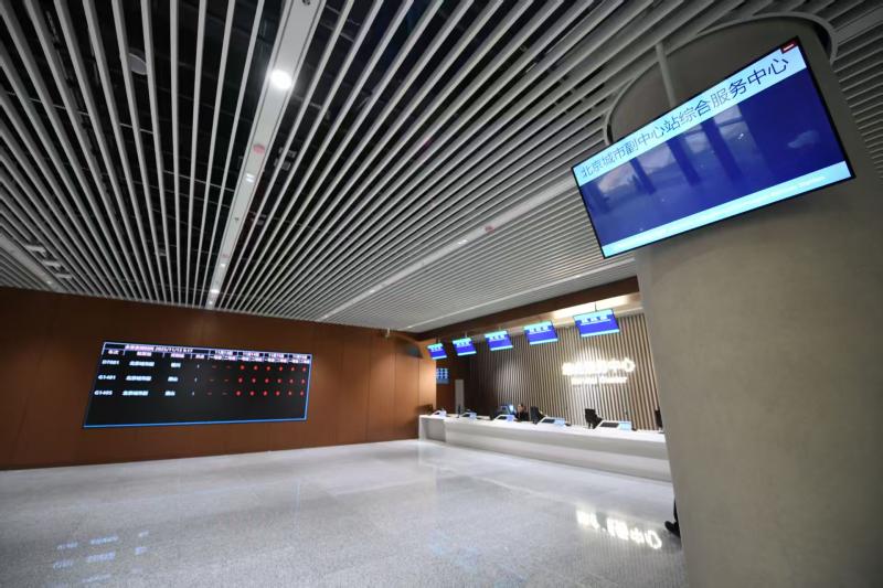 枢纽东西两侧的咽喉区(B0.5层)规划了公交场站与旅游大巴区域。B1层兼具进站功能与城市服务,城市通廊、下沉广场、商业步行街及配套设施错落分布,宛如一座开放包容的“城市会客厅”。乘坐火车的旅客需在此完成实名制验证验票进站和安检(试运行期间)。铁路综合服务中心也位于该层南侧,可办理火车票购买、改签、退票以及临时身份证制证业务。