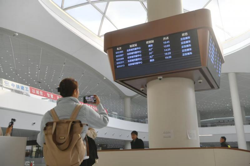 旅客安检后,可乘坐电动扶梯抵达B2层,这里以城际铁路候车厅和轨道交通换乘为主,未来地铁6号线、平谷线在此实现无缝衔接,同时布局了出租车、网约车区,方便旅客快速换乘。据北京城市副中心站站长柴宇介绍,该层东西两侧分布着检票口,目前共设置7个检票口(分A口和B口),合计14条检票通道。“试运行阶段,车站每天8点20分到18点20分,开行去往燕郊站、大厂站的京唐城际列车共6对,北京城市副中心站到燕郊站只需10分钟左右。”