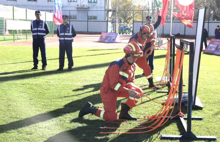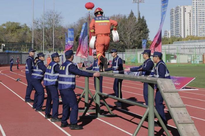 经过前期的赛前培训、初赛、复赛等环节,最终共15名选手晋级决赛。赛场上,选手们围绕400米疏散物资、百米障碍、一人三盘水带连接操、绳结技能操4个实战科目展开巅峰对决。扛假人冲刺的身影尽显力量,水带连接的精准操作彰显专业,绳结技能的娴熟手法体现功底——每一个科目都复刻实战场景,每一次突破都凝聚日常训练的汗水。