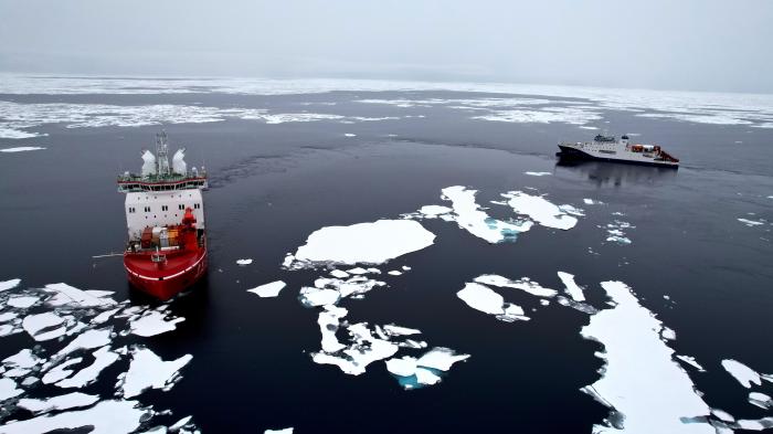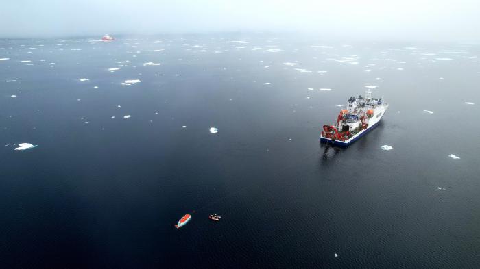 2025年8月10日,“蛟龙”号在北极冰区深潜归来。上边为“雪龙2”号,左下边为“蛟龙”号,右边为“深海一号”(无人机照片)。