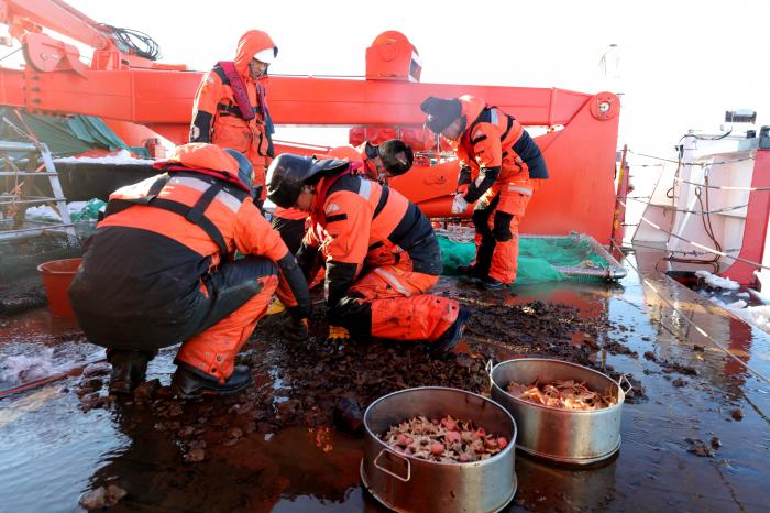 2025年9月10日,科考队员在“雪龙2”号艉甲板进行底拖网作业。