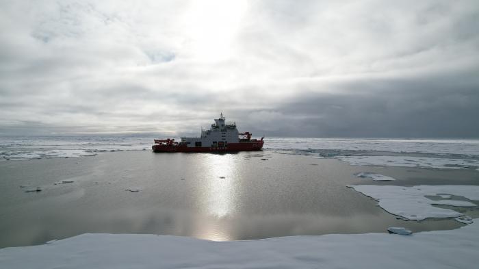 2025年8月20日,“雪龙2”号极地科考破冰船在北冰洋进行科考。气候变暖,北极海冰加速消融(无人机照片)。