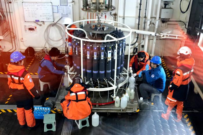 2025年8月19日,科考队员在采集CTD(温盐深剖面仪)带回的水样品。