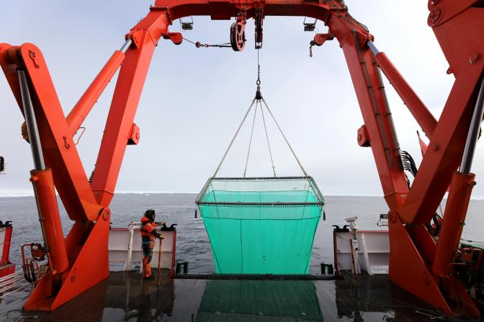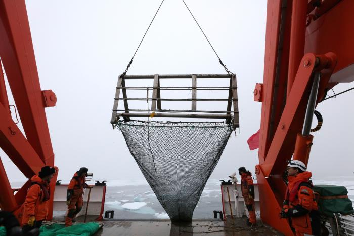 2025年7月30日,科考队员在“雪龙2”号艉甲板进行底拖网作业。