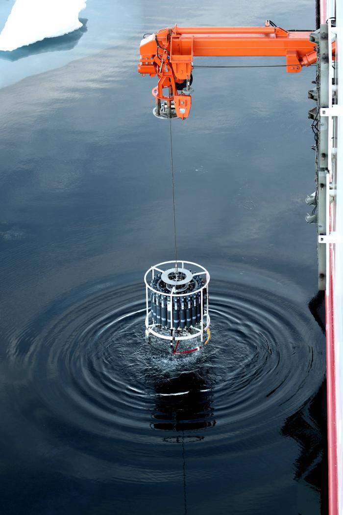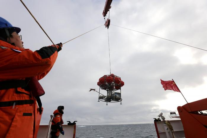 2025年8月2日,科考队员在回收CTD(温盐深剖面仪)。