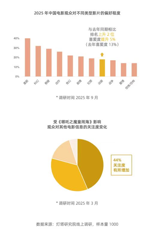 类型表现方面,动画电影表现突出,上映总数量略高于去年同期。《哪吒之魔童闹海》以现象级表现拉升大盘。灯塔研究院线上调研显示:《哪吒之魔童闹海》的火热不仅提升了观众对动画电影的偏好程度,其引发的观影热情更持续外溢至其他影片。调研数据显示,超四成观众表示受该片影响,对其它电影信息的关注度也有所增加。近半数观众坦言,在过去半年,“支持国产动画”是其走进影院的重要动因之一。
