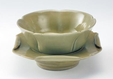 唐代越窑青釉荷叶形带托瓷盏(见图①)出土于宁波和义路唐代码头遗址。茶盏呈五曲荷花形,配套的茶托如卷边荷叶,它通体施以温润的青釉,色泽如玉,完美展现了唐代越窑“千峰翠色”的巅峰工艺。考古发现,和义路一带曾是越窑青瓷外销的重要集散地,这件茶盏或许就是当年准备装船出海的外贸商品。