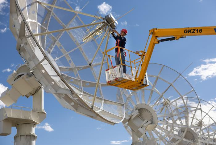 2025年9月19日,工作人员在位于四川省稻城县的子午工程二期圆环阵太阳射电成像望远镜进行设备运维。新华社记者 江宏景 摄