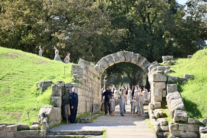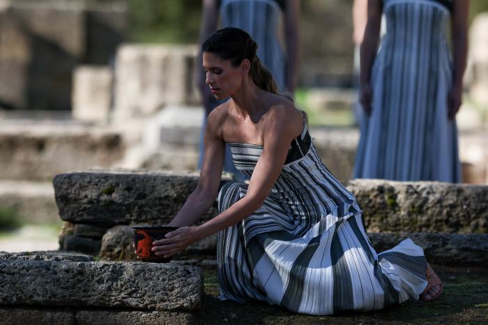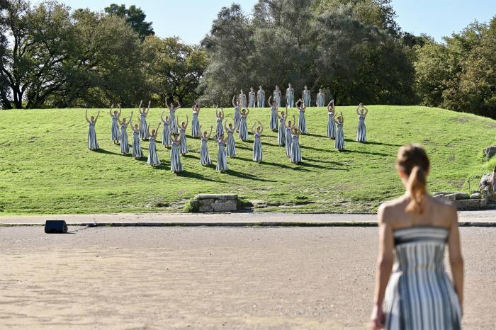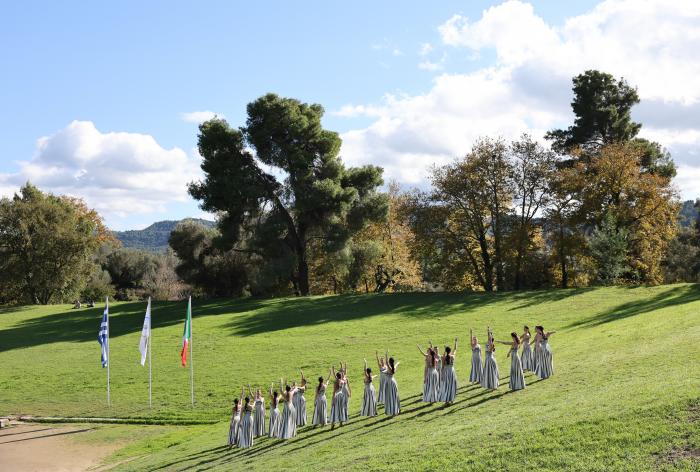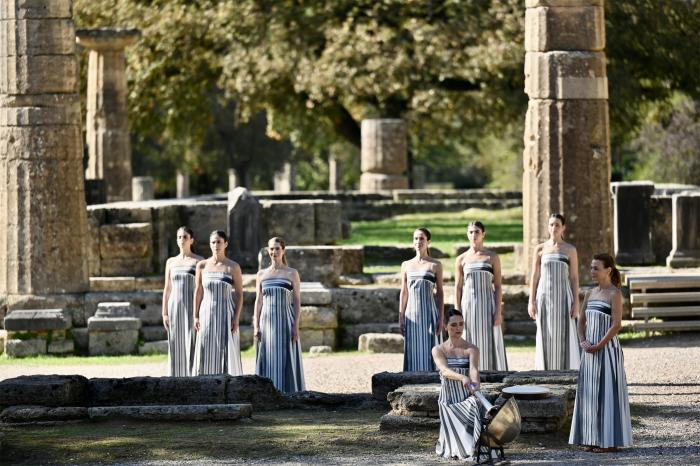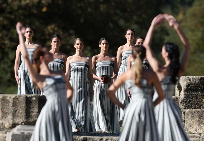 11月24日,2026年米兰-科尔蒂纳冬奥会圣火火种采集仪式在希腊伯罗奔尼撒半岛的古奥林匹亚遗址举行彩排。