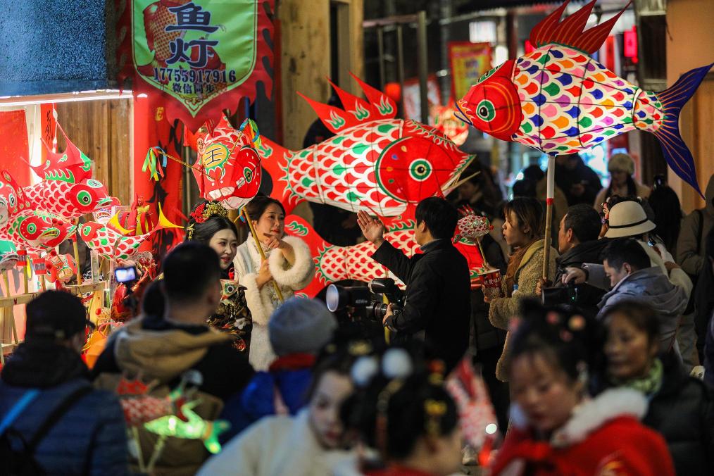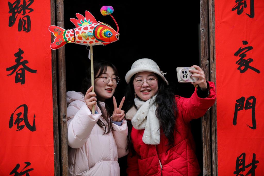 2月7日,游客在瞻淇村和鱼灯合影。