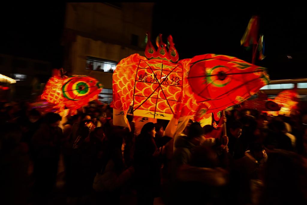 长达7米的大鱼灯,需数十人合力抬游。孩童手中举着小鱼灯,迷你灵动,相映成趣。