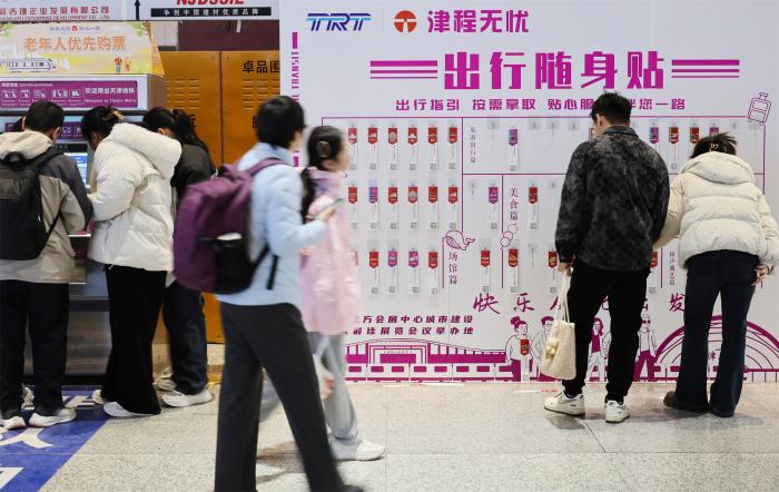2月19日,在天津西站地铁站出入口处,乘客拿取出行随身贴。出行随身贴上标有地铁站附近的景点、美食、娱乐活动等信息,方便乘客出行参考。新华社记者 李然 摄
