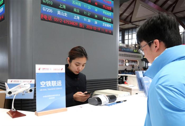 2月19日,在江苏苏州站候车大厅,旅客在东航“空铁联运”服务柜台办理值机托运。春运期间,苏州站启用东航“空铁联运”服务柜台,为搭乘高铁前往上海虹桥、浦东两大航空枢纽的中转旅客提供一站式值机服务。新华社发(杭兴微 摄)