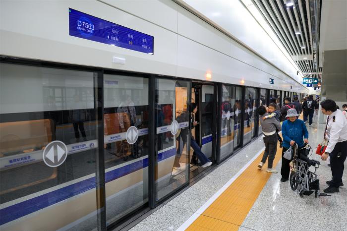 这是2月12日在深圳福田站拍摄的新屏蔽门。今年春运前,福田站1至4站台智能全滑动式站台屏蔽门系统投入使用。新的屏蔽门启用后,福田站可以接入高铁列车车型增多,旅客发送能力提升明显。新华社记者 毛思倩 摄