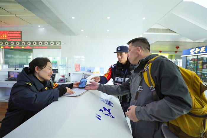 2月19日,江苏泰州站工作人员帮助旅客进站乘车。新华社发(汤德宏 摄)