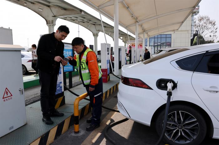 2月19日,在四川省成乐高速公路东坡区段的眉山服务区,工作人员为旅客(左)提供新能源汽车充电服务。新华社发(姚永亮 摄)