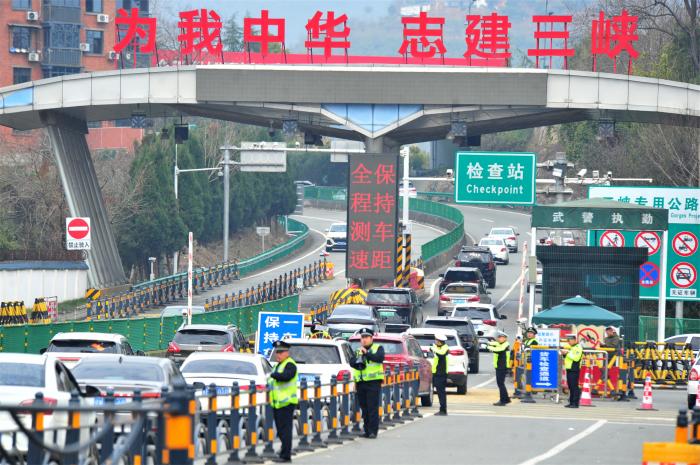 2月19日,车辆在民警的指挥下有序通过湖北省宜昌市夷陵区冯家湾检查站路段。新华社发(张国荣 摄)