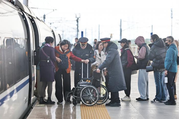 2月19日,工作人员在南京火车站帮助一名老人乘车。新华社发(苏阳 摄)