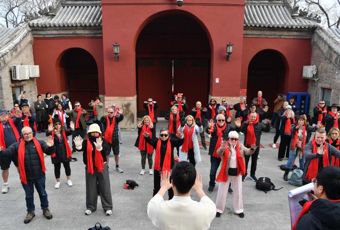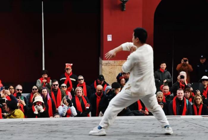 上午9时,鼓楼脚下红墙映福、鼓乐和鸣,一场饱含中国特色的太极表演拉开了欢迎仪式序幕,刚柔并济的招式吸引澳洲游客纷纷驻足跟学,沉浸式感受中华传统文化的独特魅力。
